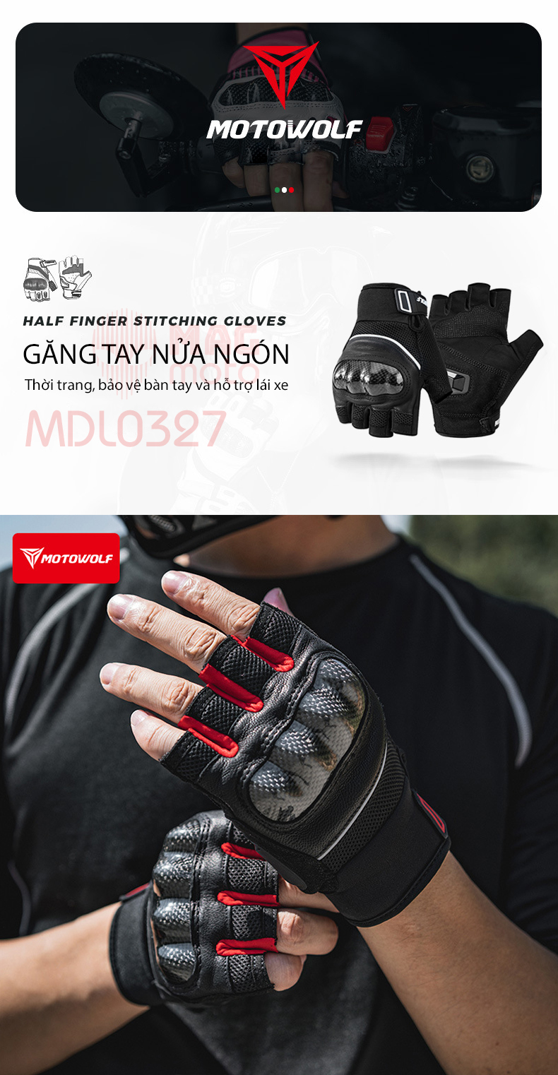 Găng Tay Gù Carbon MOTOWOLF MDL0327 Cụt Ngón được làm từ chất liệu vải dù và lưới 3D tạo cảm giác thông thoáng kết hợp da cứng cáp tăng độ mài mòn cao bảo vệ bạn một cách toàn diện khi phượt xa.