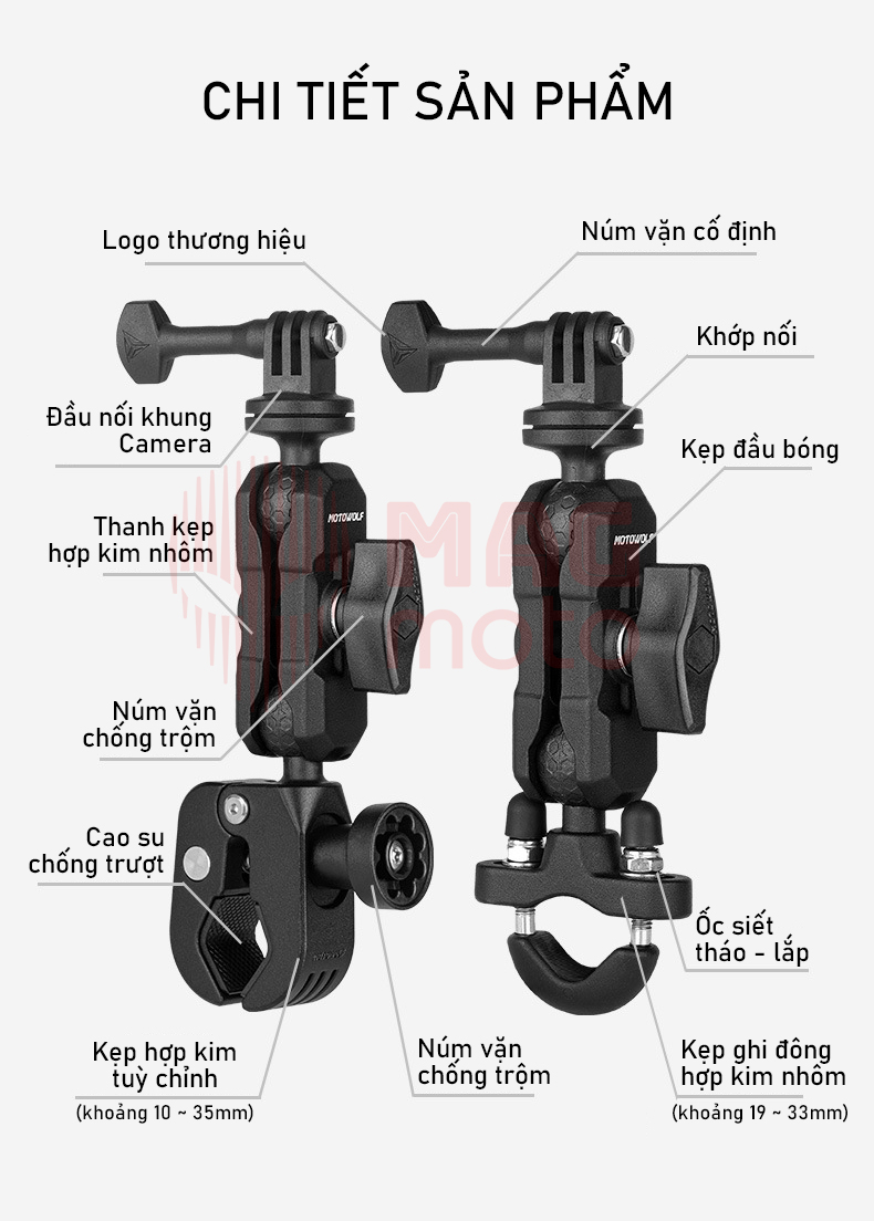 - Lắp đặt trên ghi đông, chống đổ, hoặc vị trí khác có đường kính kẹp từ 10-35mm