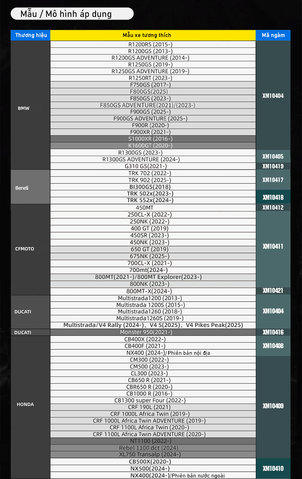 2/ Ngàm XM10409 phù hợp cho các dòng xe: