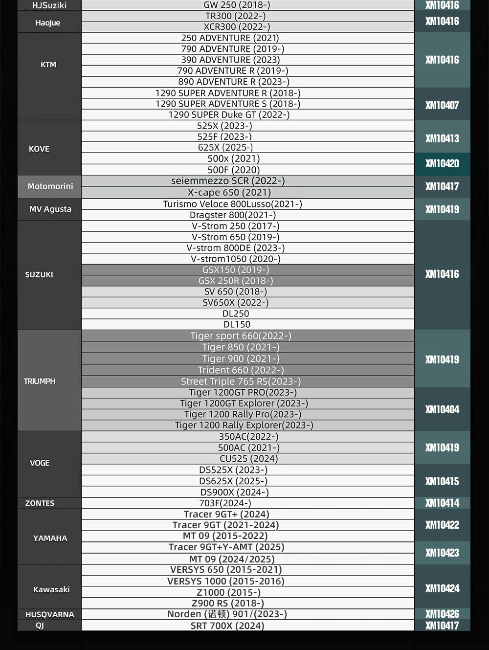 *SUZUKI: V-Strorm 250 (2017), V-Strorm 650 (2019), V-Strorm800DE (2023), V-Strorm 1050 (2020), GSX150 (2019), GSX 250R (2018), SV650 (2018), SV650X (2022), DL250, DL150.