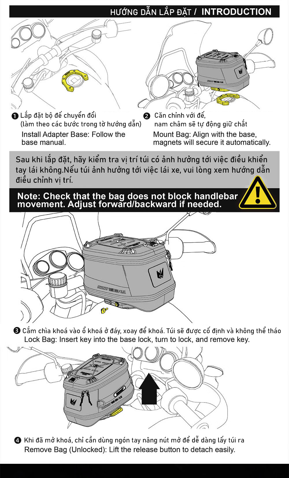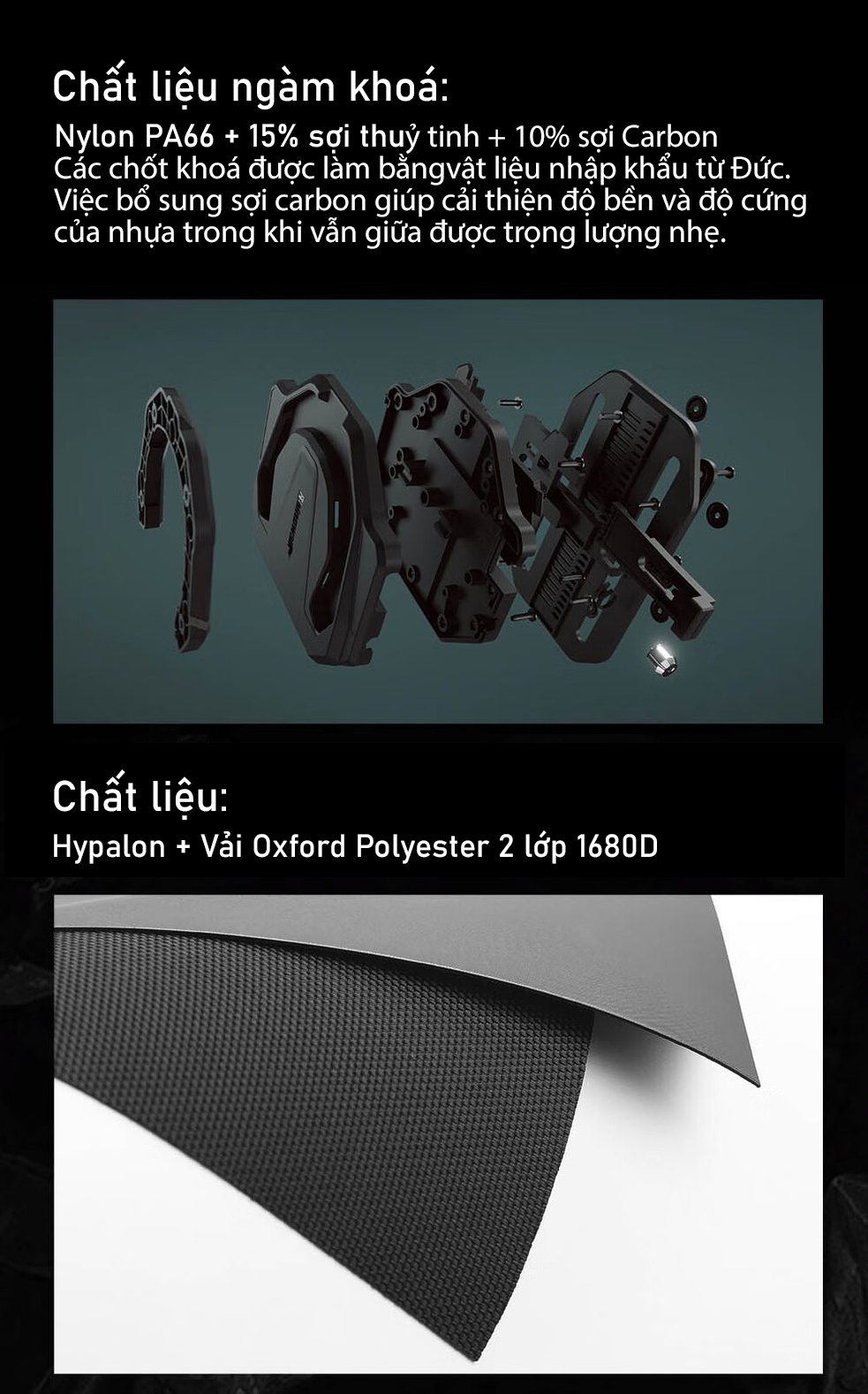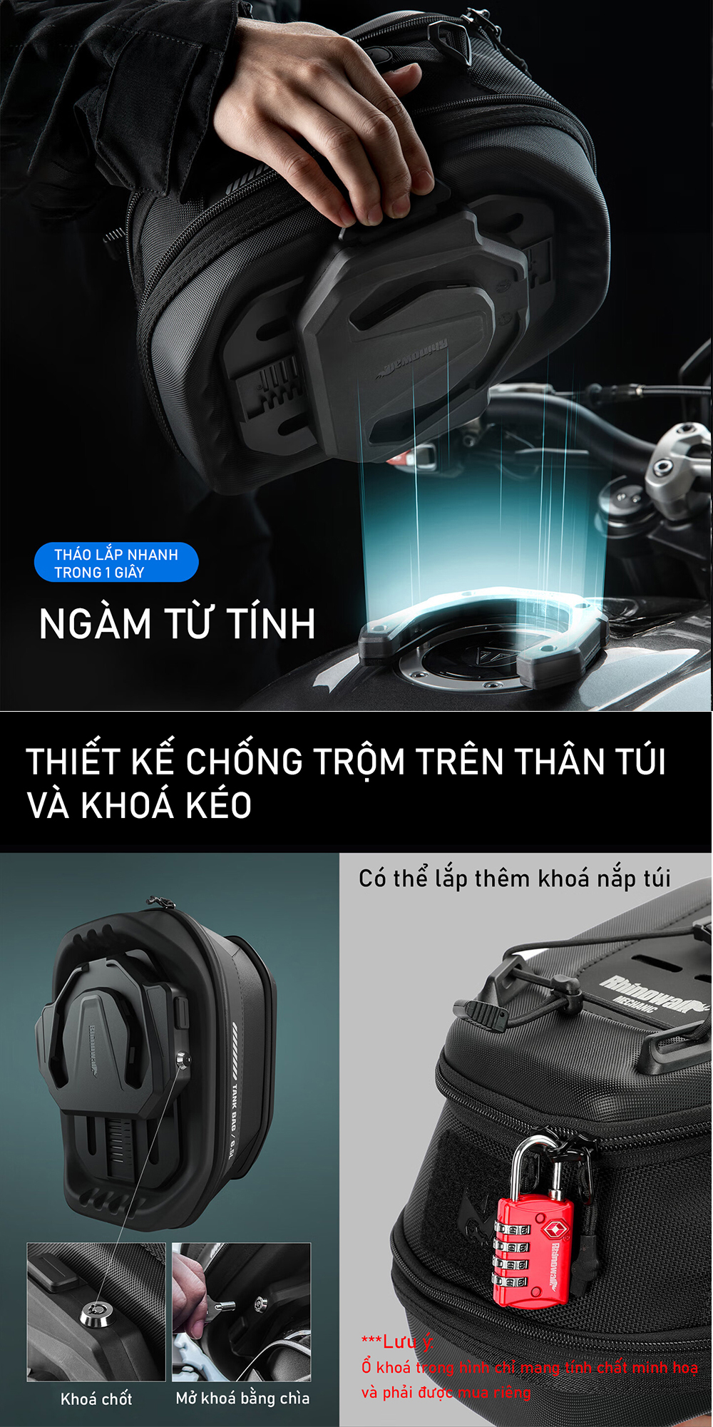 - Khoá từ tính siêu tốc tháo lắp chỉ trong 1S: Công nghệ khoá từ tính độc quyền, bạn chỉ cần đặt túi lên bình xăng là khoá tự động gắn chặt, và chỉ cần một thao tác tháo rời trong 1 giây khi cần.