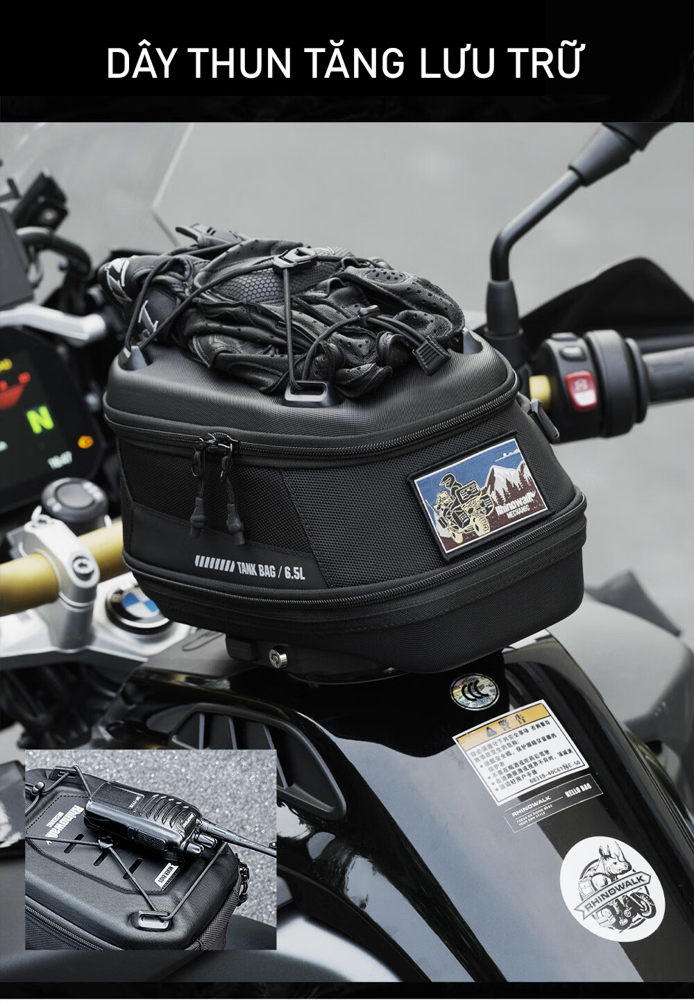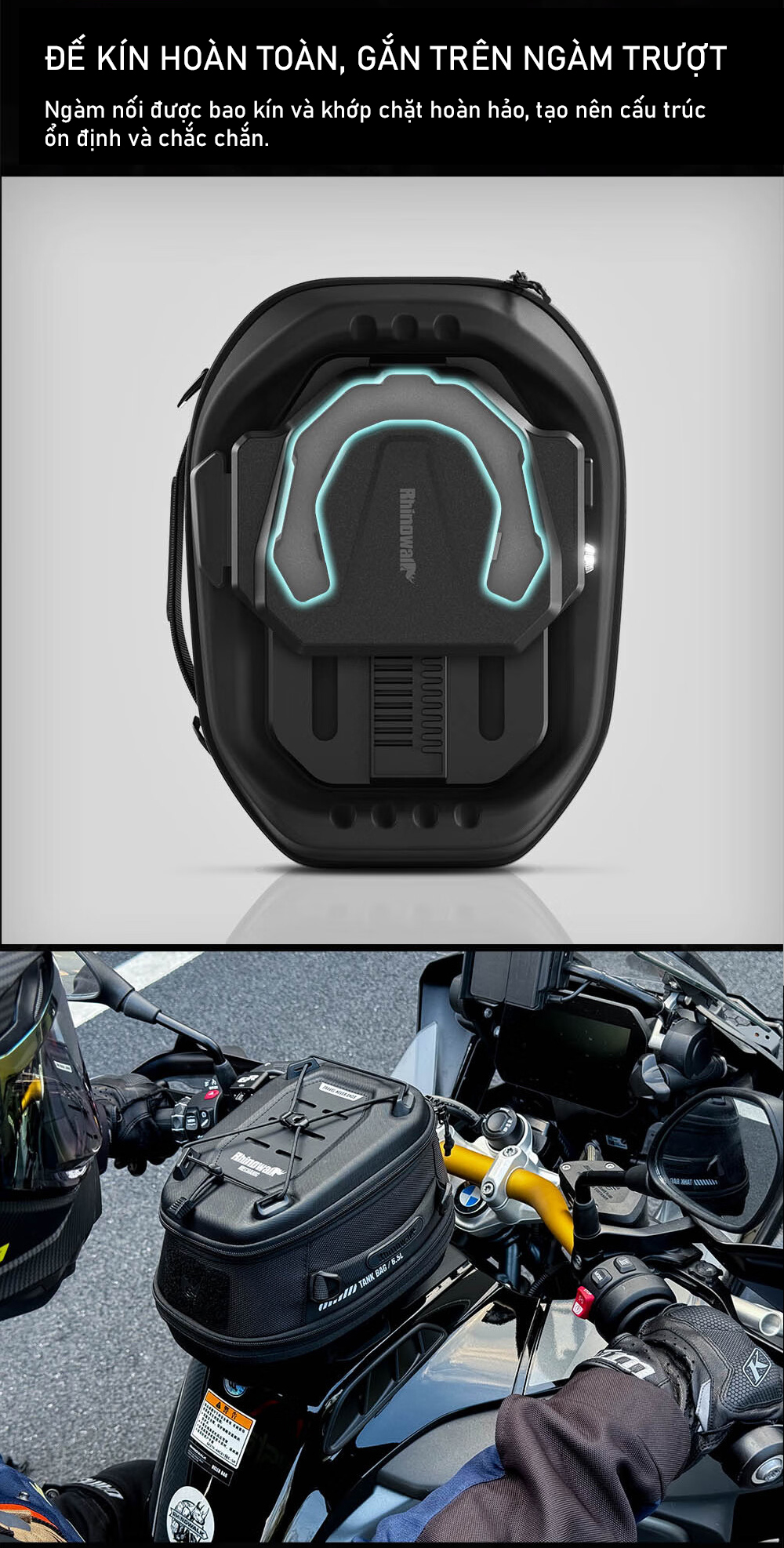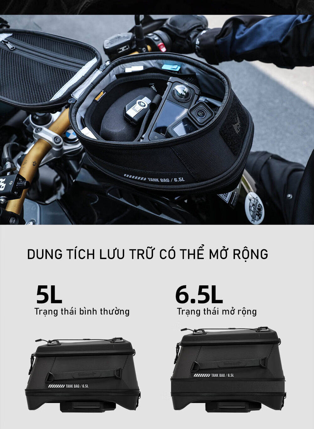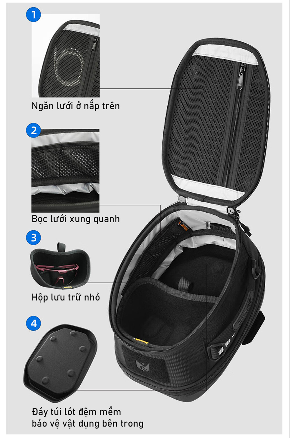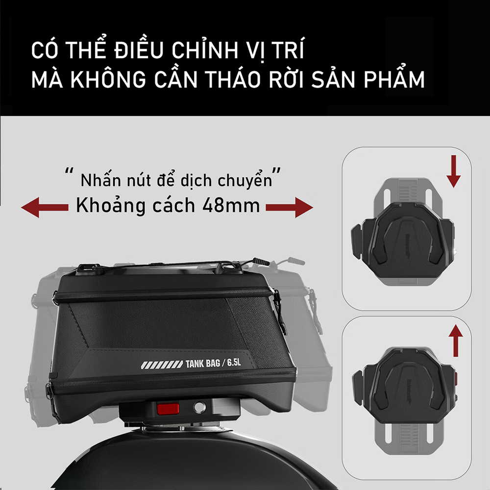 - Khoá từ tính siêu tốc tháo lắp chỉ trong 1S: Công nghệ khoá từ tính độc quyền, bạn chỉ cần đặt túi lên bình xăng là khoá tự động gắn chặt, và chỉ cần một thao tác tháo rời trong 1 giây khi cần.
