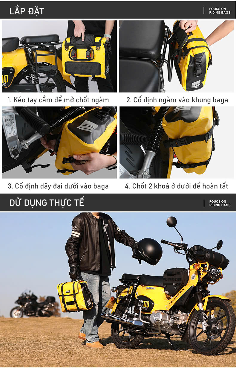 - Dung tích 15L (nếu sử dụng 2 túi cho cả 2 bên, dung tích lên tới 30L): Phù hợp cho các chuyến đi dài, giúp bạn mang theo mọi vật dụng cần thiết.